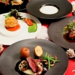コース料理のテーマ「信州のクリスマス」にふさわしい地元・長野県にこだわった食材をオードブルからメインディッシュ、デザートまで使用。クリスマスリースに見立てた信州サーモンのムースリーヌのオードブル、長野県産りんごをフォアグラととともにタルトタタン風に仕上げた濃厚なひと皿に加え、長野県の「善光寺秘蔵酒」を使った平目の魚料理、長野メルローの赤ワインソースで仕上げたメインディッシュ等、コースのひと皿ひと皿に長野県の食材の魅力が詰まっています。