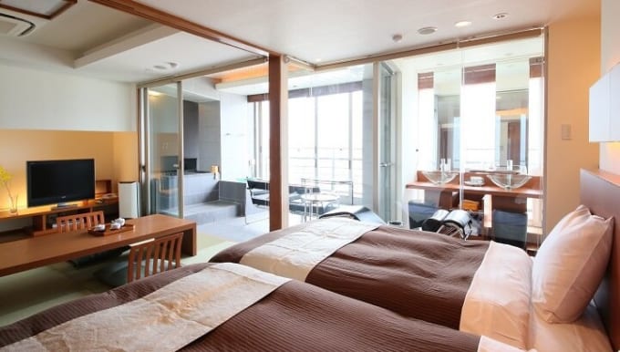 客室は、河口湖の眺望を楽しめる「半露天風呂付特別室」や絶景の富士山を眺められる「庭付き露天風呂付客室」があります。
