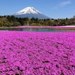 富士山の手前には大池公園のポプラ並木が並び、夏は新緑、秋は紅葉と絶景!四季折々の景色を楽しめます。特に産屋ヶ崎(うぶやがさき)寄りの河口湖大橋から富士山を撮影するのがおすすめ。