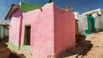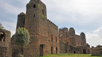 エチオピア北西のゴンダールにあるファジル・ゲビは、世界遺産の宮殿が小高い丘に建ち...