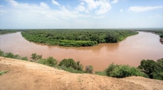 エチオピアの南西部ス-ダンの国境付近の町、オモラテ近郊にあるオモ川下流域。この地...