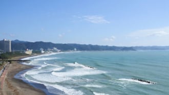 南国風の木々が立ち並ぶ、急カーブを描いたようなビーチと街並みが印象的な千葉県鴨川...