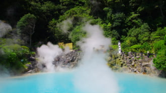 年間の観光客が800万人を超える名湯、別府温泉。大分空港からバスで約50分で着く...