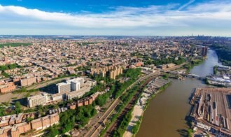 ニューヨーク市ブロンクスのハーレム川に面した地域には港や倉庫、工場が立地。中央部...
